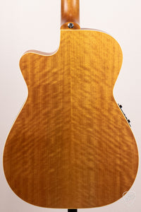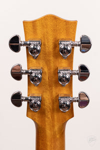 The Maton EBG-808-TEC bears an light aging toner on the AAA Grade Sitka Spruce top. A light Vintage Amber stain on the Queensland Maple back, sides, and neck could easily be mistaken as Mahogany.
