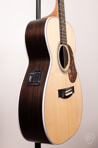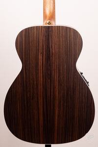The result is a small-bodied guitar with a full tonal response that rings like a bell. There is no lack of bass due to the thinner body depth (the body is 10mm thinner than the 75th Anniversary body) as the depth is offset by the incredible rich bass produced by the rosewood back and sides. The reduced body depth also provides a little more focus in front of the guitar which will make it a brilliant recording instrument.
