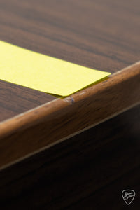 There is a small indentation on the front that is about an inch under the bridge. We tried to photograph it but it was too minor to be captured in a photo. There is a small ding on the bottom back binding that you can see in the last photo. It is very small and the picture makes it look worse than it is! Neither spot will affect the value of this wonderful piece.