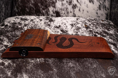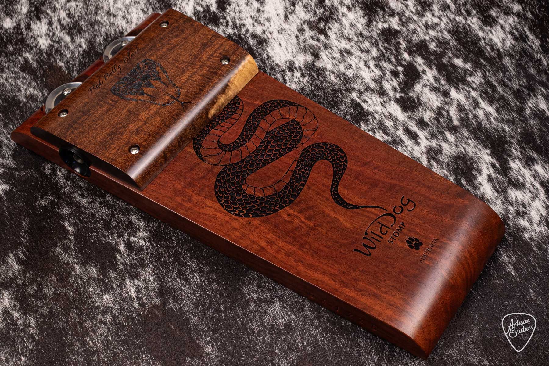 New for 2026, the Wild Dog Red Belly Black stomp is handcrafted from solid native woods, with their unique jingles feature, which can be switched off quick & easily with the roller thumb-wheels.