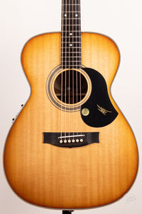 The whole guitar is finished in our high gloss finish and has a vintage amber sunburst soundboard and vintage amber back sides and neck. The finish pulls all the pieces together aesthetically and is also super thin, allowing the guitar to shine tonally from it’s very first strum.