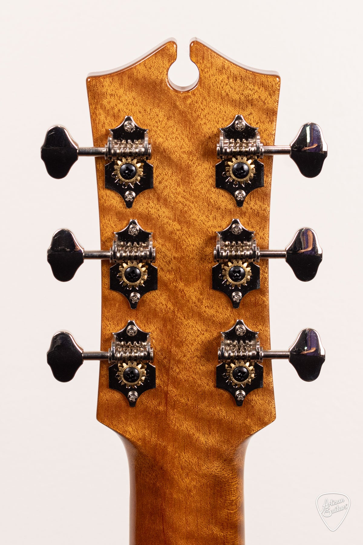 The ebony headstock is adorned with a seven-piece gold or black Mother of Pearl inlay of a diamond. The diamond represents 75 years, the “diamond anniversary”. It also has a keyhole at the top of the headstock. This keyhole was first introduced on our “Messiah” range in 1977 and has since become a well known feature on many guitars in our upper range.