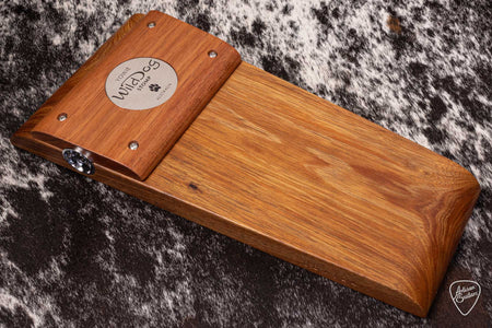 The Yowie has long been the front runner of the Wild Dog range. All solid timbers give this stomp box a distinctive look and serious bottom end thump. It also features a fatigue reducing rolled heel which allows the foot to pivot rather than lift, thus significantly reducing the tapping effort. The raised tone bar provides an instant sweet spot for a deep warm tone.
